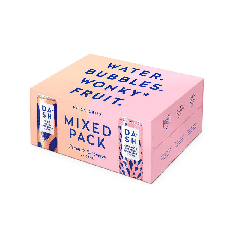 Dash Water Raspberry and Peach Mixed Pack is selection of two flavours of sparkling water infused with wonky raspberries and peaches.